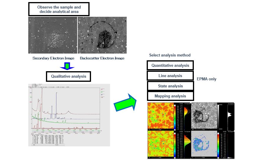 Menyinari sampel dengan berkas elektron untuk melakukan analisis unsur dan memperoleh data geometris kontaminan tingkat mikrometer pada perbesaran tinggi. EPMA dapat melakukan analisis unsur yang sangat akurat dan tepat di area yang sangat kecil dan luas.