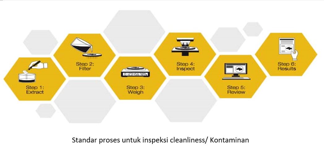 Untuk membantu memastikan kebersihan komponen dan sistem, partikel kontaminan terlebih dahulu dipisahkan dari komponen menggunakan kabinet ekstraksi di ruangan yang bersih. Kontaminan dihilangkan dari bagian-bagiannya melalui pancuran cair atau rendaman ultrasonik. Bilas pencuci kemudian disaring melalui membran untuk mengekstraksi partikel. Filter dijepit dalam suatu dudukan dan dikeringkan untuk dianalisis lebih lanjut, kemudian dipasang pada  mikroskop untuk pengambilan gambar dan pemeriksaan.