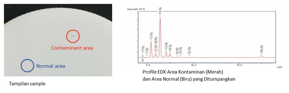 Dengan menggunakan mesin Shimadzu EDX/ FTIR dapat menganalisis jenis material kontaminan an-organik/ organik.