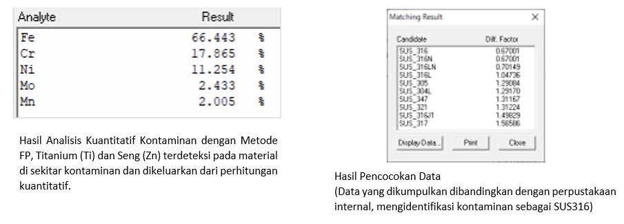 Pada contoh di bawah, fitur sistem ini memungkinkan data kuantitatif dicocokkan secara akurat dengan data referensi dan kontaminan diidentifikasi sebagai baja tahan karat SUS316