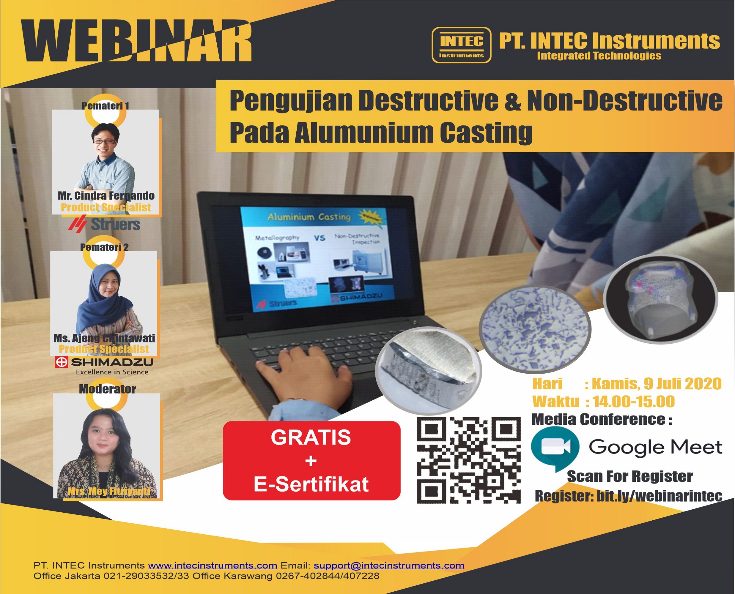 Halo sobat intec, buat kalian yang ingin tau tentang perbedaan pengujian aluminium casting dengan metode Destructive dan Non-Destructive, kalian bisa ikuti webinar yang di selenggarakan oleh PT. INTEC Instruments secara gratis loh plus dapat E-Sertifikat juga.