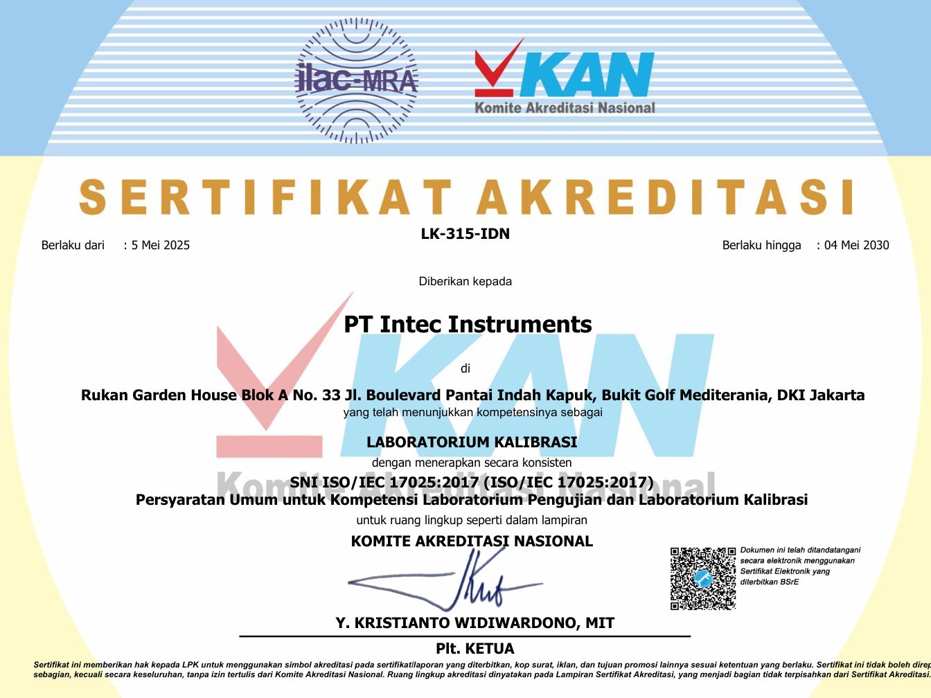 Pada tanggal 05 Mei 2025, badan Komite Akreditasi Nasional ( KAN ) memberikan Sertifikat Akreditasi kepada PT. INTEC Instrumets, yang menyatakan bahwa “ PT. Intec Instruments telah menunjukkan kompetensinya sebagai LABORATORIUM KALIBRASI dengan menerapkan secara konsisten SNI ISO/IEC 17025:2017 ( ISO/IEC 17025 : 2017 ).